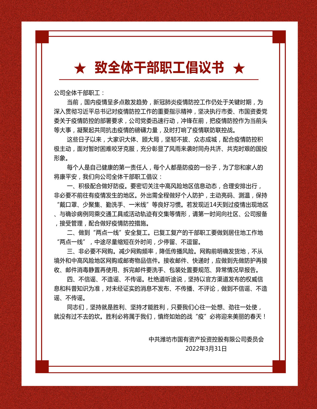 致公司全體干部職工的倡議書
